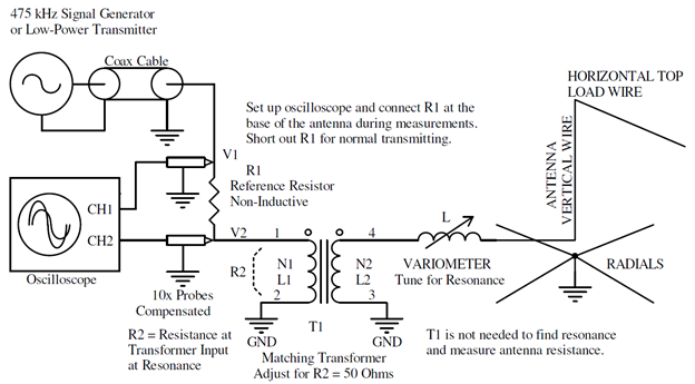 OK, the resistor isn’t actually used for matching, just for measurements. And you’ll need a few more things. You have to build a variometer to resonate the antenna, and a transformer to match it. You’ll also need a signal generator or low-power transmitter and an oscilloscope. Here’s the test setup and procedure:
