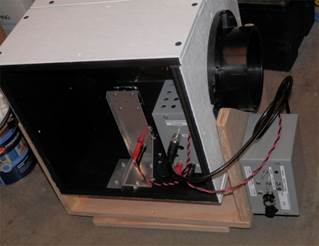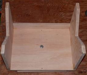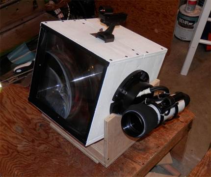 A wooden fork holds the box, and two 1/4-20 bolts form an altitude bearing. The box is tilted as required, then locked by the bolts. The receiver sits on a Celestron “Heavy Duty Alt-Azimuth” tripod that has two adjustment knobs for fine pointing.