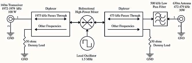 At the mixer output the difference frequency 475 kHz, sum frequency 3475 kHz, and other mixer products resulting from harmonics of the local oscillator are present. A diplexer passes the 630m signal (30 watts) to the antenna and directs unwanted frequencies (about 50 watts) to a dummy load resistor.