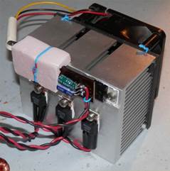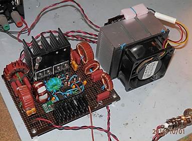 50 Ohm dummy loads mounted on a CPU cooler, with fan control circuit