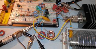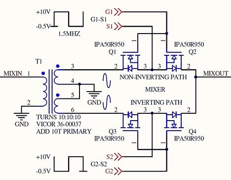 Because the mixer is only switching the analog signals passing through, it works equally well in both directions. It requires no power supply, but it does require about 1.5 watts of square wave drive power into the MOSFET gates to turn them on and off at 1.5 MHz.