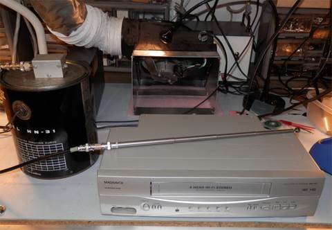 My Icom IC7410 transceiver was connected to a dummy load through a “T” connector. Another cable from the “T” led to a short whip antenna on top of the VHS unit. Transmit power was 100W to the dummy load, which produces about a 200VPP signal on the whip antenna. The antenna is far too short to radiate at 3.5 MHz, but will produce an RF electric field to nearby objects. [Don’t panic! I’m an electrical engineer and can guarantee that the physics of this situation cannot produce any RF exposure hazard. However, don’t try this with a 100W VHF or UHF transmitter as the radiation from the whip will be very strong!]